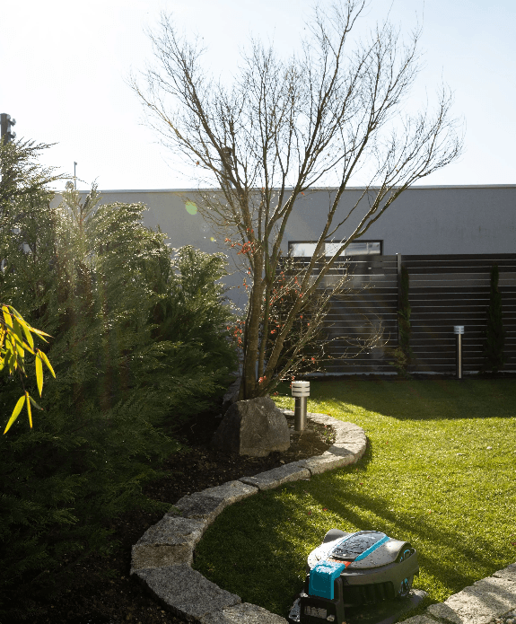 Die grosszügige Rasenfläche wurde mit hochwertigem Rollrasen gestaltet, der sofort ein sattes Grün in den Garten brachte. Als besonderes Highlight pflanzten wir eine mehrstämmige Felsenbirne, die im Frühling mit üppiger Blüte begeistert. Die übrige Bepflanzung hielten wir bewusst reduziert, um den pflegeleichten Charakter des Gartens zu wahren und die architektonische Wirkung der Gneisplatten gezielt hervorzuheben.